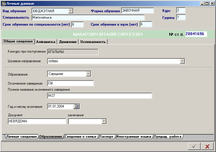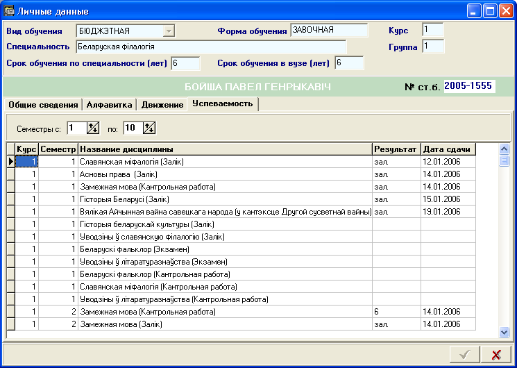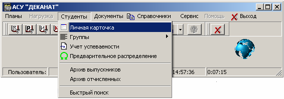 Подсистема "Студенты" дает возможность доступа к информации о студентах, которая хранится в отделе кадров, а также позволяет вести работу в разрезе академических групп и подгрупп, кроме этого есть функция учета успеваемости.